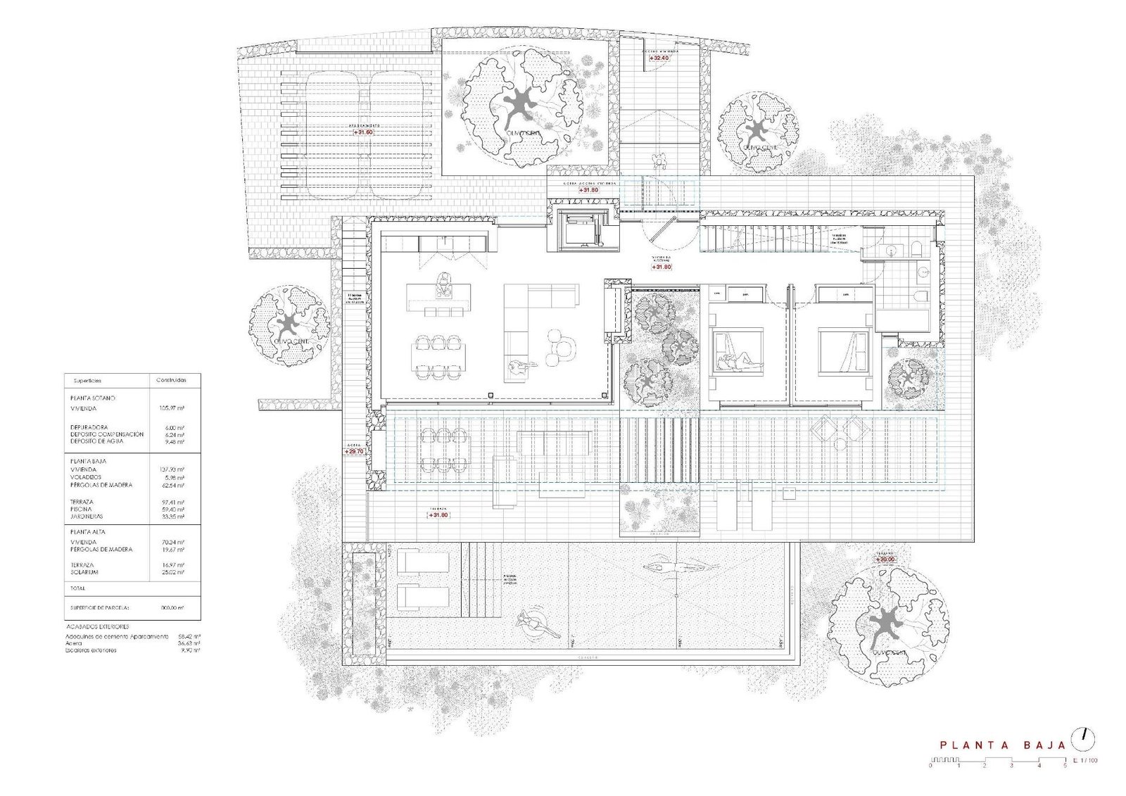 The lower floor of 105.97 m² is designed for both practicality and leisure. It includes a fully equipped gym, laundry room, and technical areas, with the option to adapt additional spaces as a wine cellar, cinema, or multipurpose room. This level also houses the pool’s filtration system and water tanks, ensuring efficient management of all technical installations.