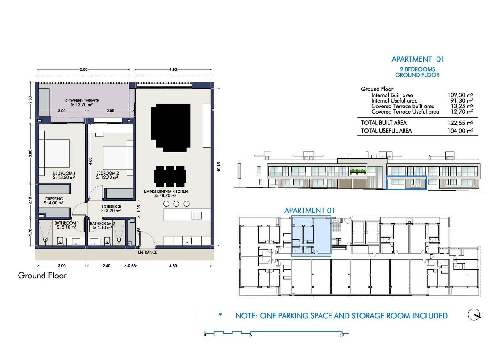 Apartments are available with one, two or three bedrooms, offering options such as ground floors with private gardens or top floor units with terraces and solariums. Each apartment includes underground parking and a storage room with elevator access.