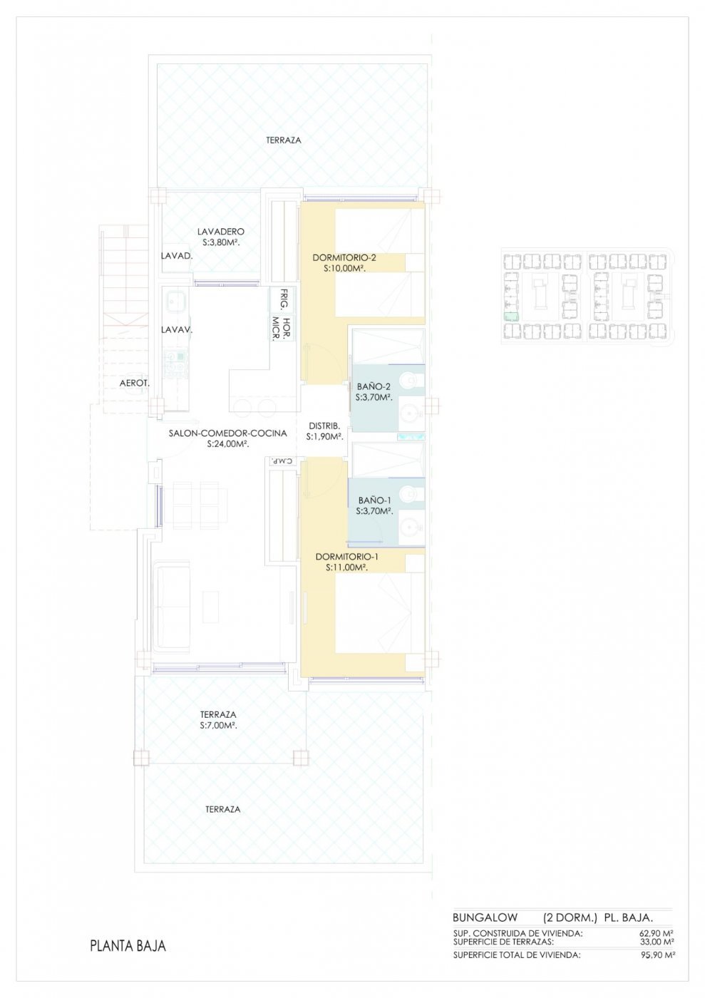 Complex consist of 104 bungalow apartments with 2 and 3 bedrooms, top floor bungalow has private solariums with panoramic views to the salt lake and ground floors bungalows have big terraces overlooking the green area.